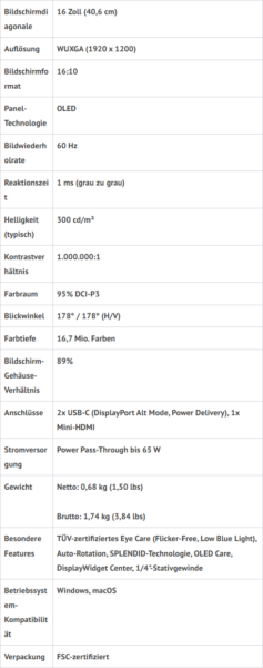 Das OLED-Panel des ZenScreen OLED MQ16FC sorgt durch eine Reaktionszeit von nur 1 ms für eine flüssige Darstellung und für eine hochpräzise Farbwiedergabe durch einen Delta E < 2 Wert. Mit dem speziellem „M Model-P3“-Modus passt sich der Monitor perfekt an macOS-Geräte an und synchronisiert die Farbwiedergabe.
