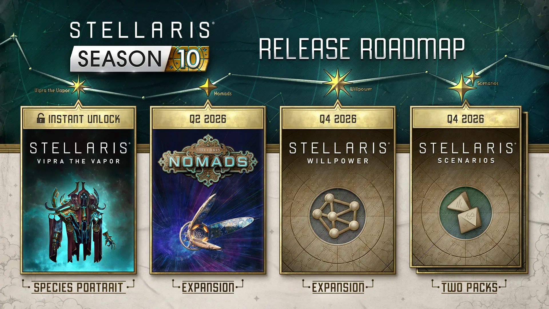 Der Season 10 Expansion Pass nimmt die Spielerinnen und Spieler mit auf eine Reise, geprägt durch Herausforderungen und Wandel, beginnend mit der großen Erweiterung Nomads. Dieser DLC erscheint im zweiten Quartal 2026 und führt kolossale Arche-Schiffe ein. Diese werden die Völker, Industrien und Ambitionen der Spieler quer durch die Sternensysteme befördern. Sie können sich frei durch die Galaxie bewegen, neue Nomadenreiche gründen, Aufträge von sesshaften Imperien annehmen, neue Ursprünge erkunden, eine neue Megastruktur errichten, eine neue Reihe von Heldenschiffen entdecken und durch den Bau von Wegstationen ihre Spuren hinterlassen.