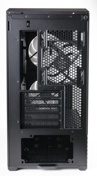 Die Rückseite wurde ganz klassisch gestaltet. Vorhanden sind zwei Löcher für Mainboardblende und Netzteil, Slotblenden sowie ein vorinstallierter 120-mm-Lüfter.