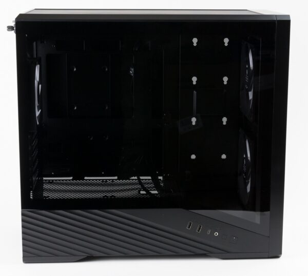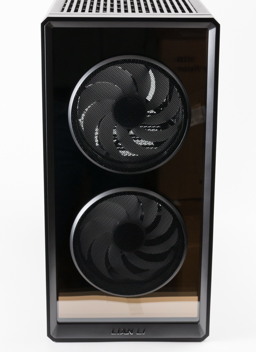 Die Front besitzt eine spiegelnde Front mit zwei vorinstallierten 140-mm-Lüftern. Durch die runden Abdeckungen vor den Lüftern wird ein interessanter Lock erzeugt.