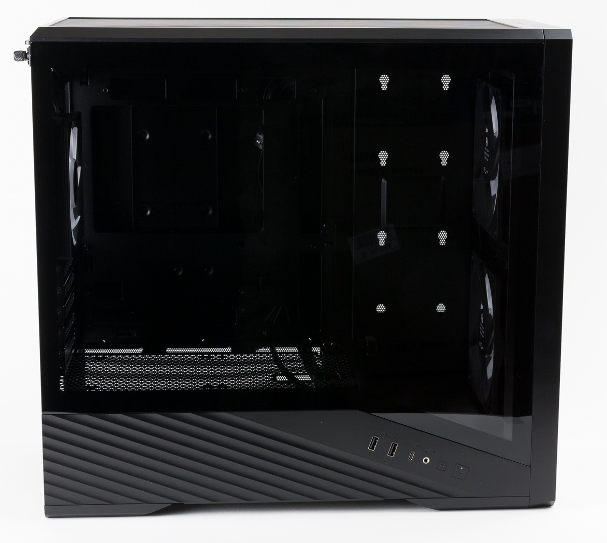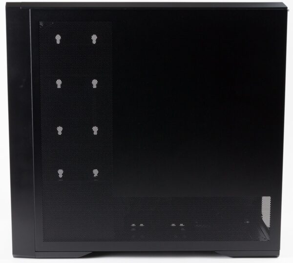 Das linke Seitenteil besteht zu einem großen Teil aus Echtglas, welches vorne eine interessante Ecke besitzt. Das rechte Seitenteil besteht aus Metall und besitzt viele kleine Lüftungslöcher in einer L-förmigen Anordnung. Beide Seitenteile werden gesteckt und können daher zum Öffnen einfach abgezogen werden. Das Glasseitenteil wird allerdings zusätzlich mit einer Thmub-Screw befestigt, welche aber nur beim Transport des Gehäuses notwendig sein sollte.