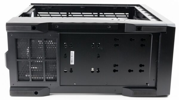 Die Unterseite besitzt vier gummierte Standfüße und einen kleinen Staubfilter für das Netzteil. Die vielen Löcher auf der rechten Seite sind für den Einbau von Festplatten oder SSDs vorgenommen worden.