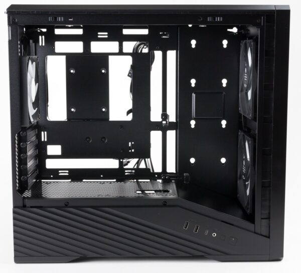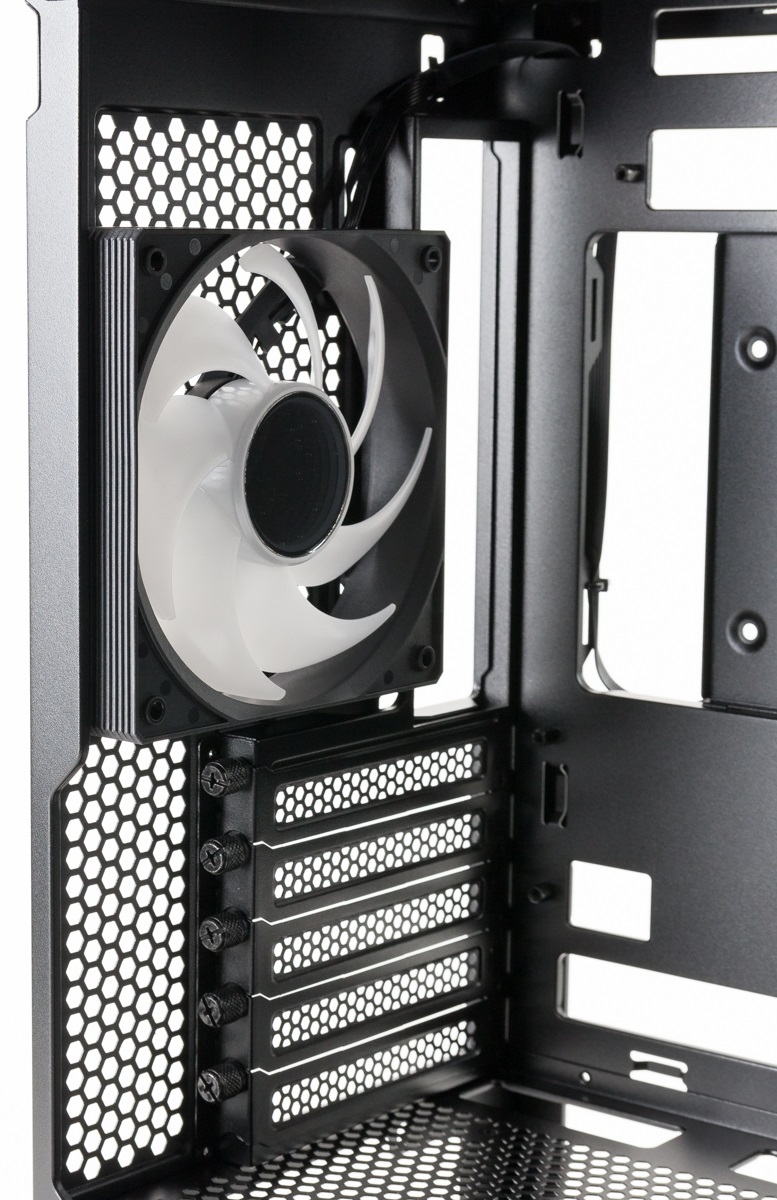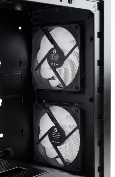 Im hinteren Bereich wurde bereits ein 120er Lüfter vorinstalliert. Hinter der Front befindet sich zwei 140-mm-Lüfter, die aufgrund der Frontgestaltung auch nicht durch kleinere 120-mm-Lüfter ersetzt werden können. Alle drei vorinstallierten Lüfter sind mit LEDs ausgestattet.