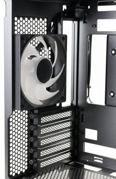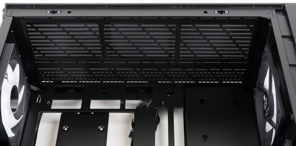 Auf der Zwischenabdeckung im Gehäuse können zwei 120-mm-Lüfter installiert werden. Unter dem Top ist Platz für drei identische Exemplare oder alternativ zwei 140-mm-Lüfter oder einen bis zu 360 Millimeter langen Radiator einer Wasserkühlung.