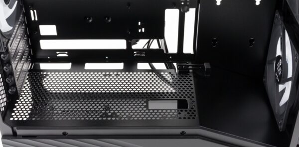 Der Innenraum des Lian Li Vector V150 INF Gehäuses ist zweigeteilt. Die untere Abdeckung ist im Frontbereich allerdings abgeschrägt, wodurch ein interessanter Look entsteht. Unter der Abdeckung ist Platz für ein Netzteil sowie Festplatten oder SSDs.